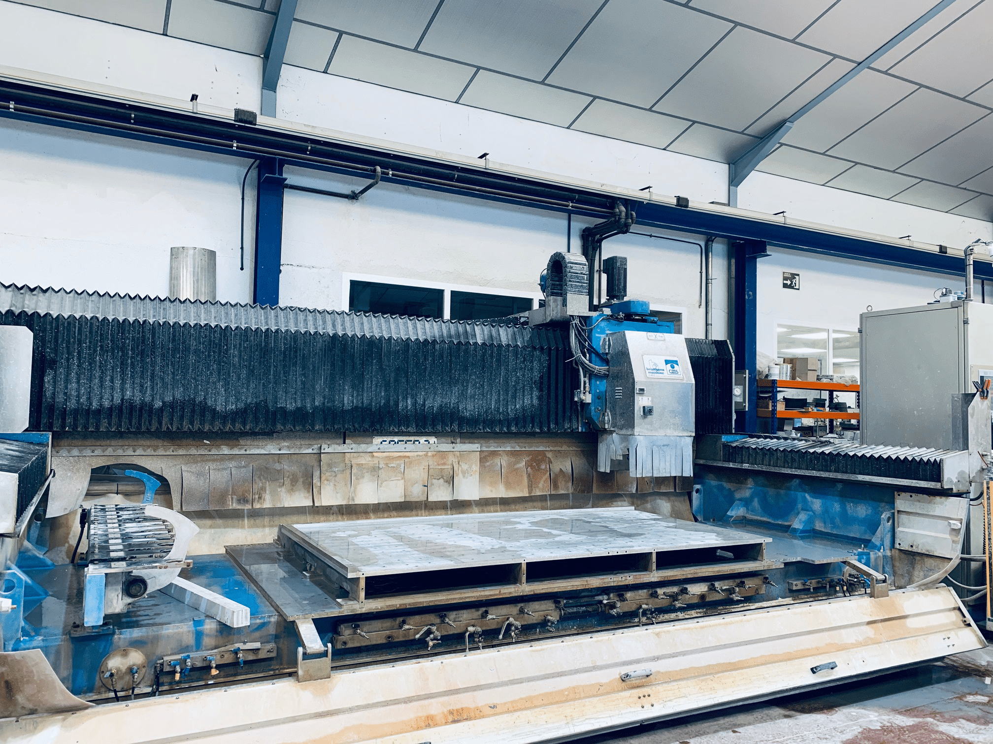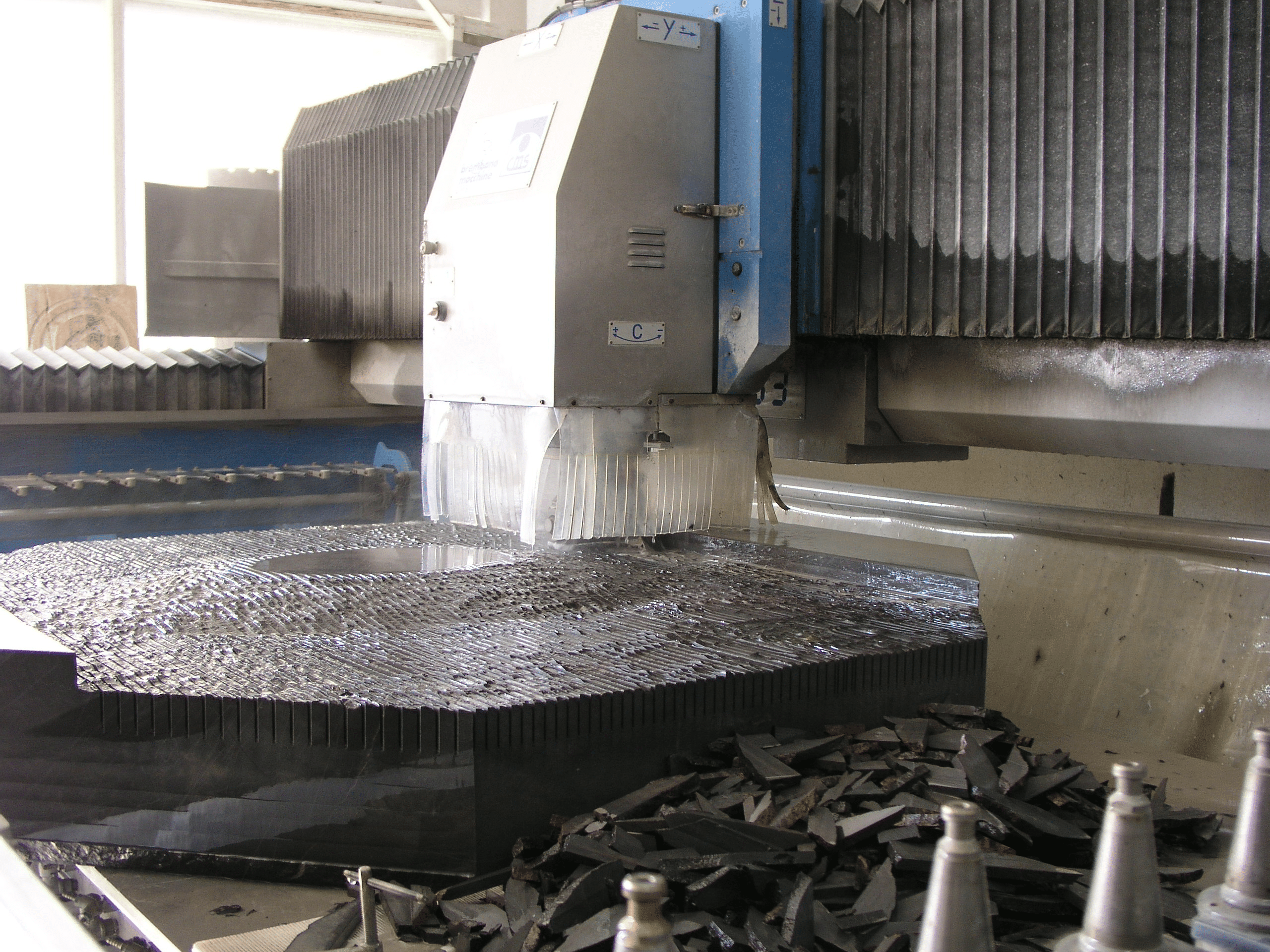 En el centro de corte por chorro de agua a presión (Water Jet) elaboramos cualquier proyecto de corte en madera, hierro, bronce, latón, piedra natural… con dimensiones de hasta 6500x3500x300 mm.